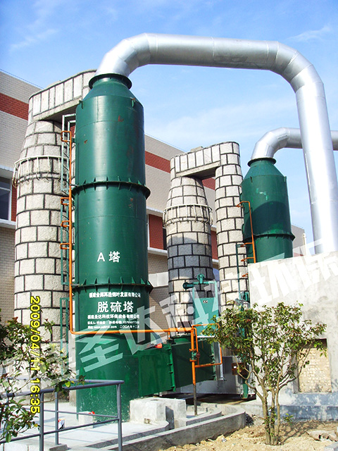不銹鋼脫硫塔、干式導流管除塵器及自動加藥設備。